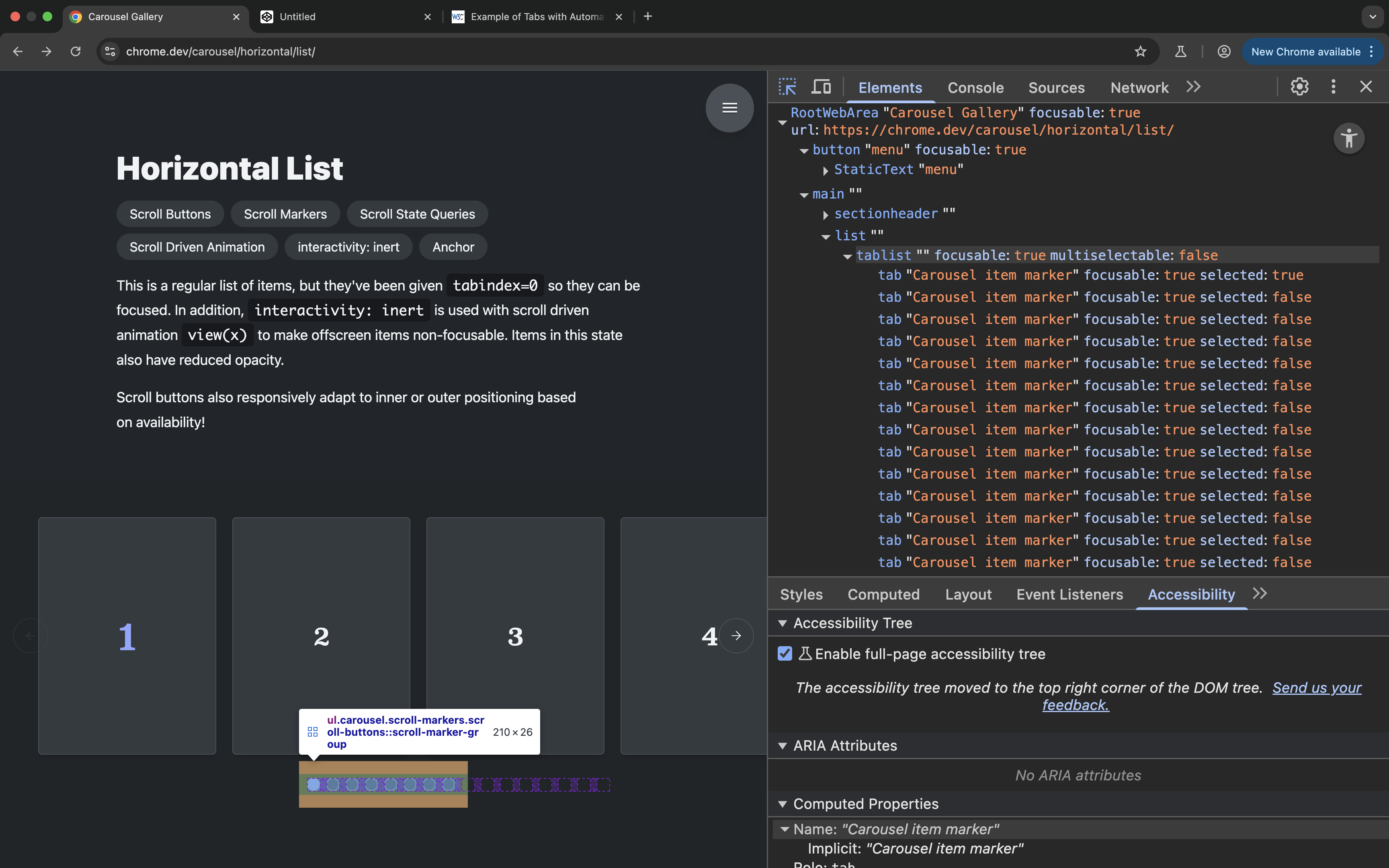 If you inspect the accessibility tree for this example, you can see the scroll marker group exposed as a tablist, and each of the three scroll markers exposed as a tab.